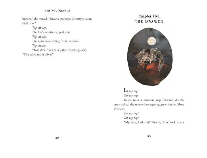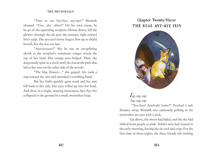 In the fourth chapter book, The Hidden Kingdom, Dawn, Tobin, and Bismark travel to a distant watering hole and strange things happen along the way. The ground crumbles, water disappears, and huge tumbleweeds chase after them! Is the forest alive? When the animals start hearing voices, they begin to wonder: are they imagining things or is something, or someone, else responsible? Only the Nocturnals can solve this mystery and unite the forest!